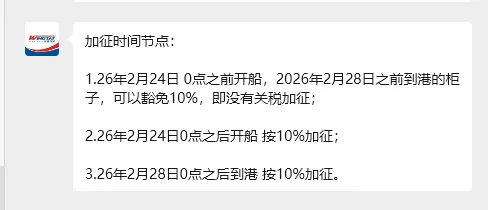 基础税率(HTS)+ 301关税7.5%或25%(如适用)+ 新增10%临时进口附加税(122 条款)