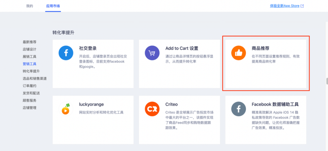看到智能商品推荐功能如此出色,广大卖家朋友是否跃跃欲试?这个功能使用很简单,只要在店匠后台中,找到应用市场-营销工具-“商品推荐”,添加这一插件。