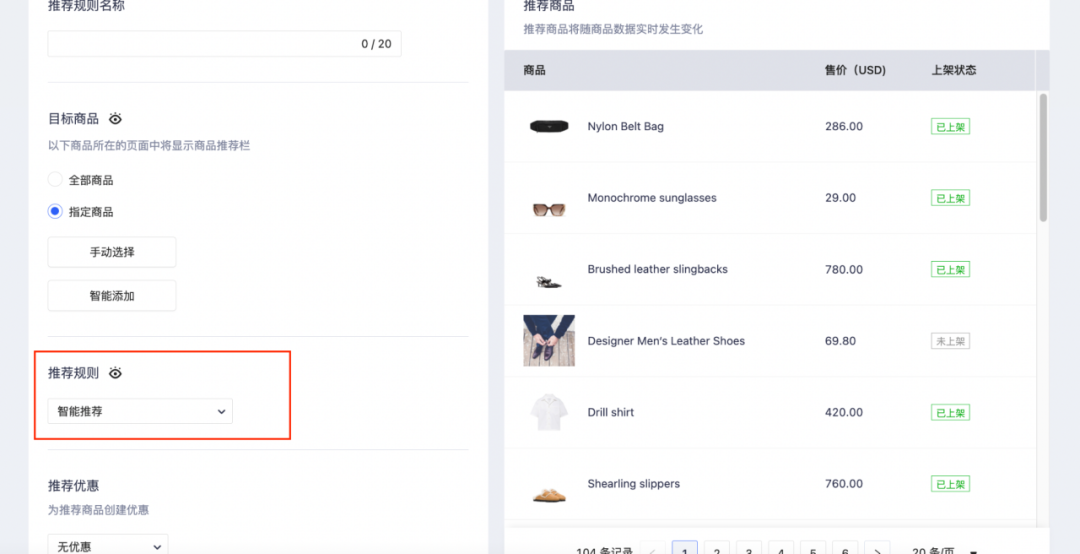 然后,在商品推荐规则设定页面编辑好规则名称、目标商品、推荐商品折扣等信息,将“推荐规则”设置为“智能推荐”,接下来,就将一切交给店匠强大的推荐技术算法吧。