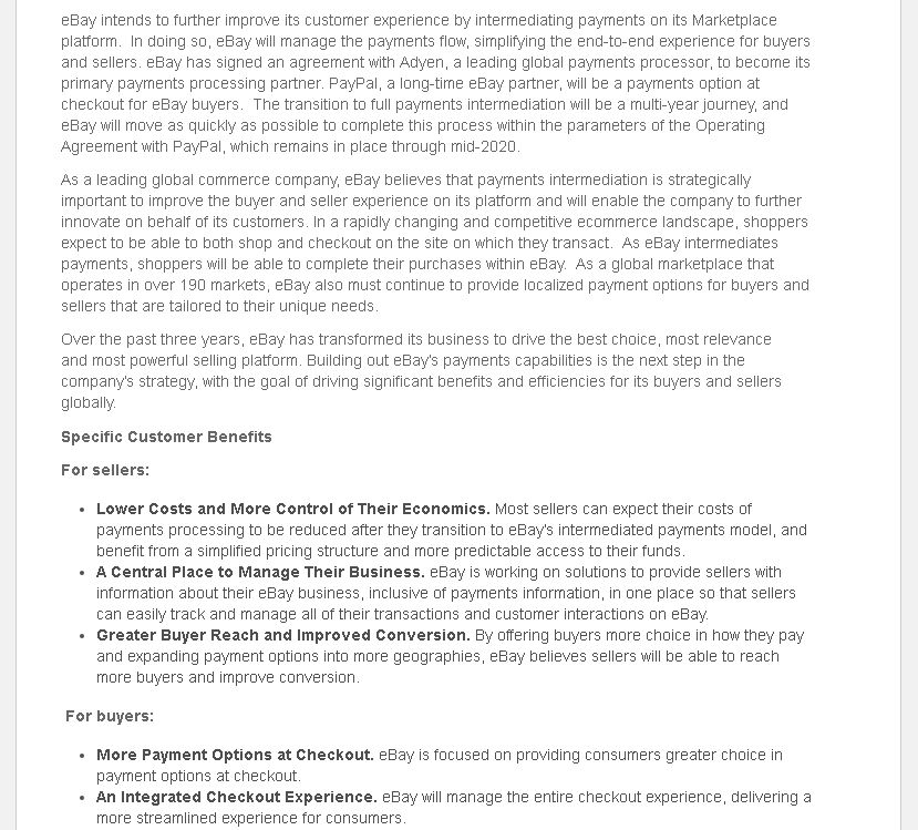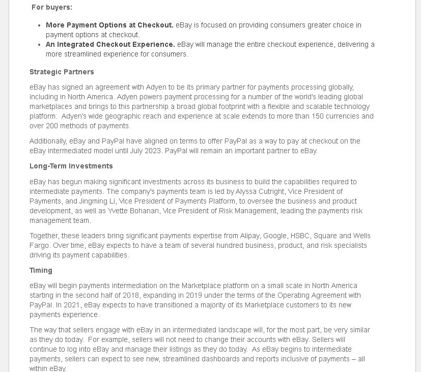 我们已与全球领先的支付处理商Adyen签署协议,Adyen将成为eBay平台的首要支付处理合作伙伴。同时,PayPal作为eBay的长期合作伙伴,仍然是买家付款时可以选择的付款方式。