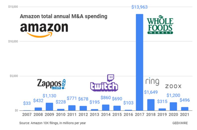 AMZ123获悉,去年,亚马逊加入了科技公司的大规模企业收购热潮。根据外媒披露的交易金额,亚马逊在2021年进行了157亿美元的收购,但在该公司最近提交的10-K文件中,其官方数字仅为4.96亿美元,远低于2020年的12亿美元,同时也是近年来最低的并购总额之一。