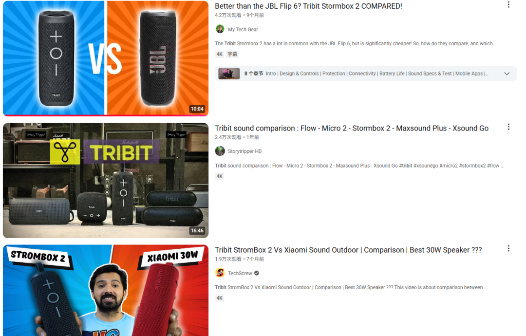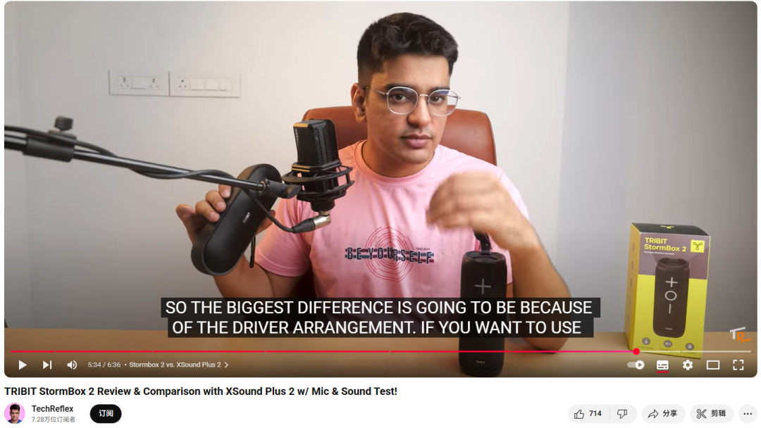 到了 YouTube,Tribit 又切换成 “专业测评模式”。和科技博主 @TechReflexh 合作的 StormBox 2 评测视频,没有花里胡哨的画面,而是实打实做 “参数实测 + 场景对比”:比如测续航,60% 音量下玩了 22 小时(标称 24 小时);讲核心亮点,重点拆 “跨型号 TWS 配对”—— 不仅能连另一台 StormBox 2,还能和同系列 XSound Plus 2 组队,不管是多人派对还是双人听歌都适配。