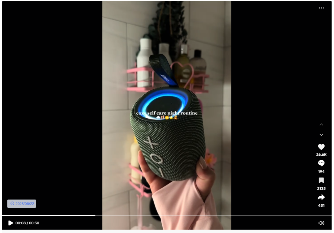 在 TikTok,它主打 “30 秒沉浸式生活片段”。比如和生活博主 @adridiaries 合作的视频,没有一句硬广,只是拍了夜间读绘本时的背景音乐、泡澡时的香薰 + 音效,配文 “my new mini tribit speaker is officially part of my routine cozy nights never sounded so good”。就这么简单的场景,收获了 26.6k 点赞,评论区全是 “我现在就需要这个”“这就是我想要的夜晚氛围”。