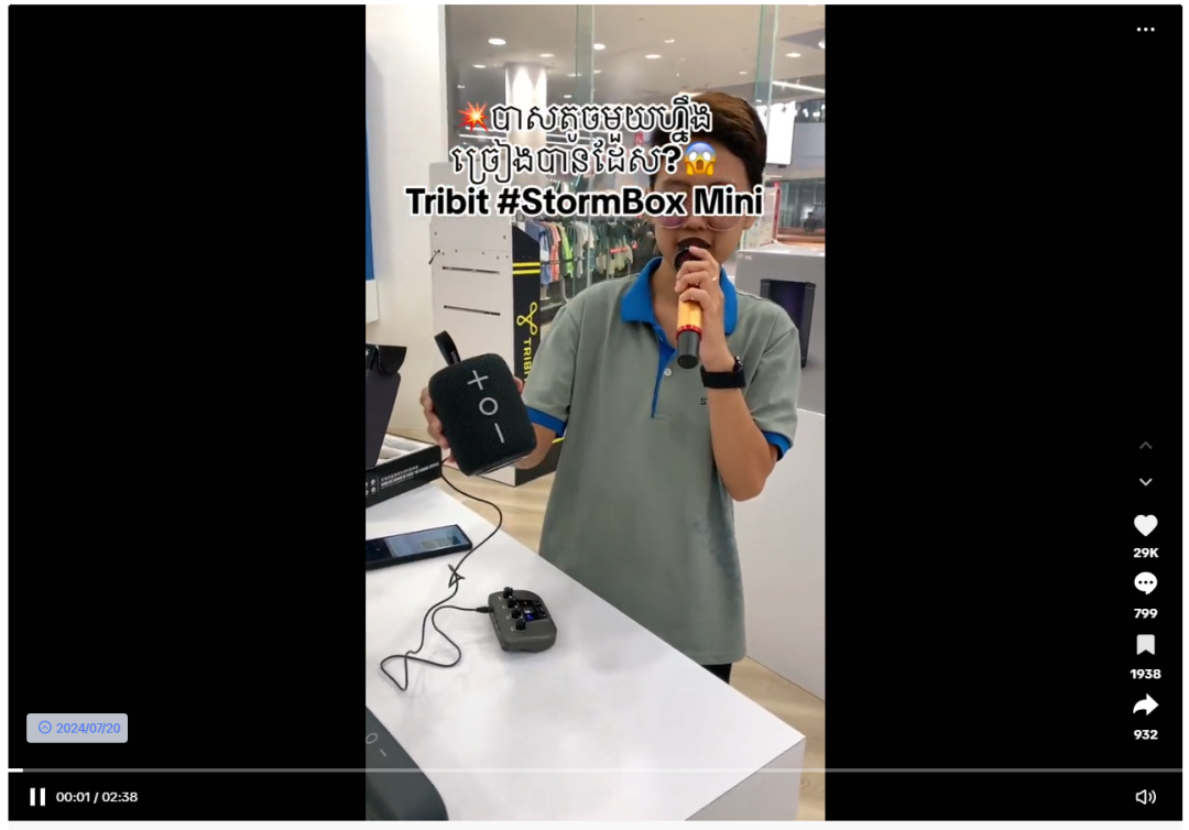 在东南亚市场,Tribit 没找大网红,而是和当地电子产品商店合作。比如柬埔寨一家商店的官号,发了条 “员工用 Tribit 音箱唱歌” 的视频,文案很接地气:“12 瓦的低音又能唱了”。