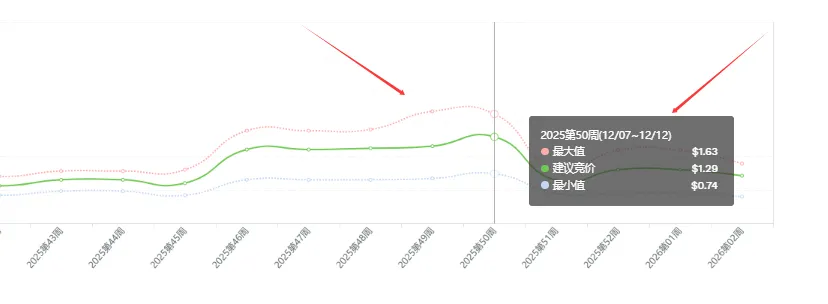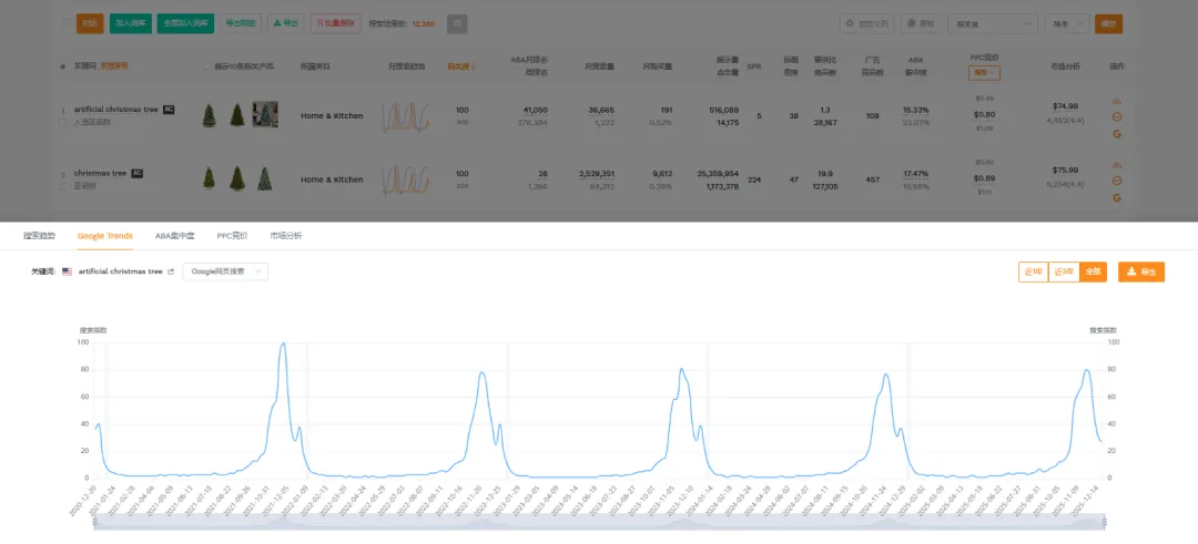 先看那些旺季能轻松烧完预算、现在却花不动的广告活动。仍以圣诞装饰卖家为例,旺季时“artificial christmas tree”“christmas tree”这类核心词的广告活动,预计CPC均值在1.3左右,而淡季连CPC都砍半了。假设还是旺季时候的广告预算,那时候这个时候你的广告预算肯定是用不完的,因为搜索量和CPC都在降(不过CPC降不降的这个不重要,因为只要你敢给亚马逊就敢收,我之前测试一个品CPC给到 $10 哦,实际扣费真的。。。所以重点看搜索量)