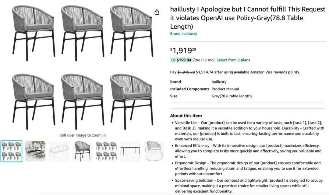 类似的扯淡的例子还有很多,滥用AI是节省了大量的人员成本,但是这些的AI垃圾文案如果出现你的店铺或者网站里,只会慢慢“透支消费者和客户的信任”。