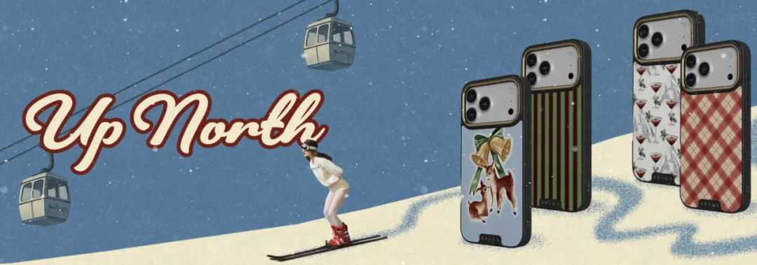 Up North系列主打复古冬季度假风格,用地理方位隐喻冬季度假场景,传递冬日限定的惬意与活力氛围;对应的手机壳图案包含雪山松木小屋、驯鹿、热可可和姜饼人等元素。
