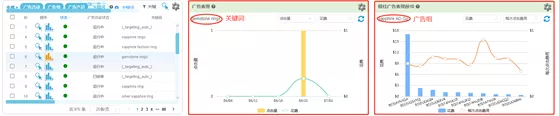在【广告表现】关联分析器中看到这个关键词的图表分析和【最佳广告表现前10】关联分析器中这个广告所在广告组的分析。