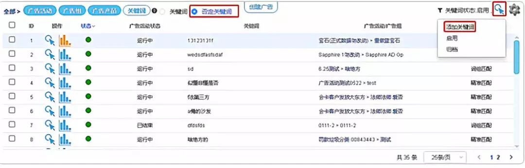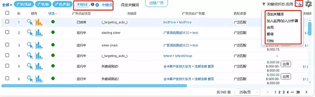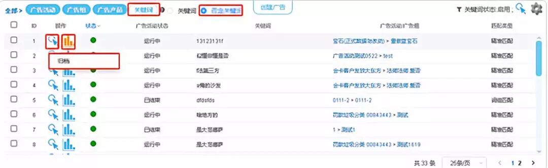 可以对关键词进行批量操作(启用、暂停和归档)。