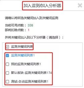 勾选关键词,点击加入监测/加入分析器,进入【加入监测/加入分析器】界面。默认是添加到【监测关键词列表】分析器中,也可以选择系统上新增的【监测关键词列表】分析器。如下图: