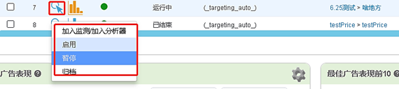 ,可以对关键词进行加入监测/加入分析器、暂停和归档。