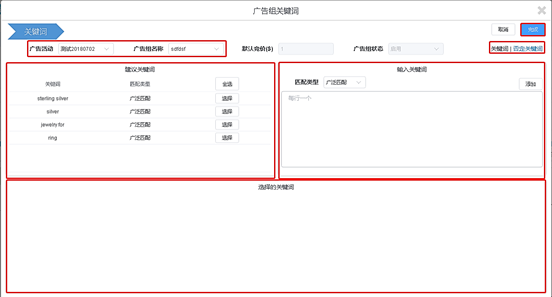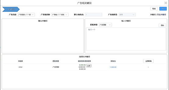 点击添加关键词,在跳出的【广告组关键词】界面中添加新的关键词或者否定关键词。