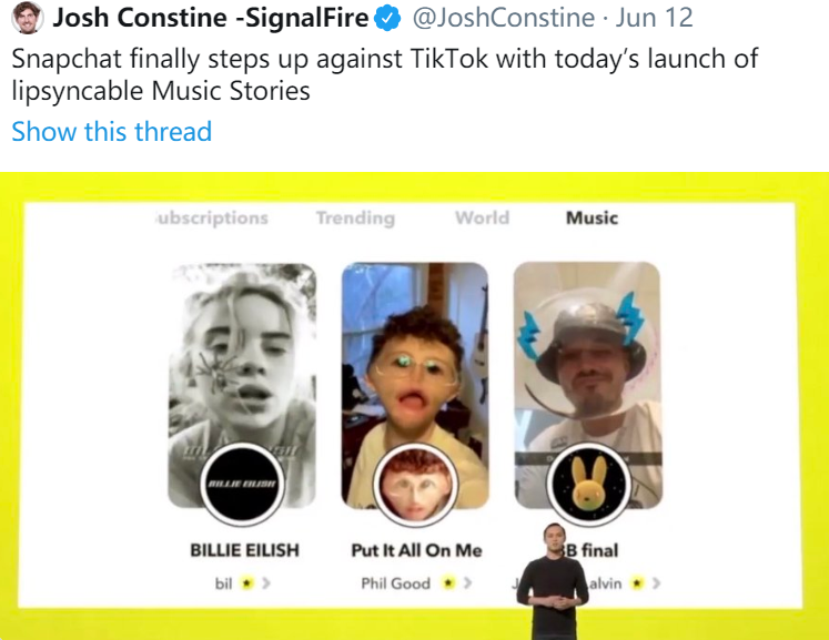 另外在内容方面还有一个值得注意的是,根据 Twitter 博主、投资人 Josh Constine 的消息,Snapchat 也推出了类似 TikTok 对口型音乐玩法的 Music Stories,但笔者没有查到其他信源。受众重合度较高,面对 TikTok 对其主导的 AR 广告市场的试探,如果是真的,Snapchat 也算回敬了。