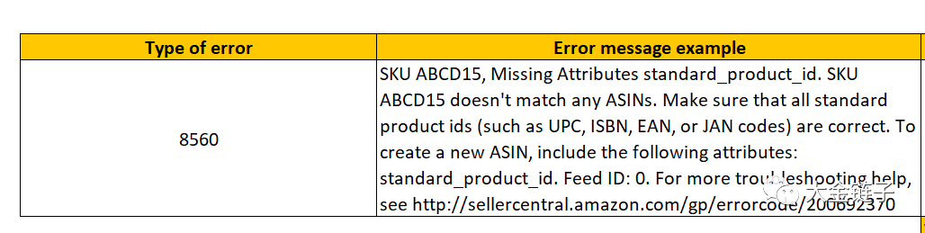 SKU ABCD15, Missing Attributes standard_product_id. SKU ABCD15 doesn't match any ASINs. Make sure that all standard product ids (such as UPC, ISBN, EAN, or JAN codes) are correct. To create a new ASIN, include the following attributes: