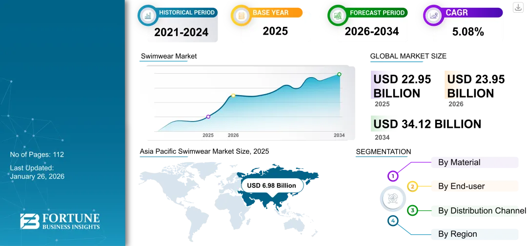 据 Fortune Business Insights 数据,2025 年全球泳装市场规模为 229.5 亿美元。预计到 2034 年将达到 341.2 亿美元,预测期内复合年增长率( CAGR )为 5.08%。