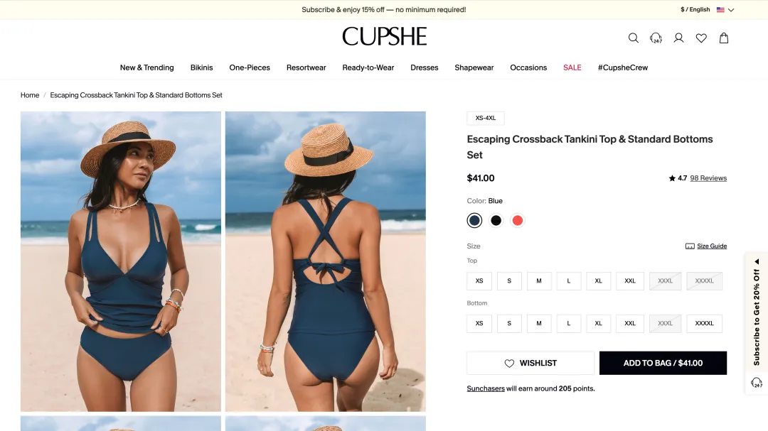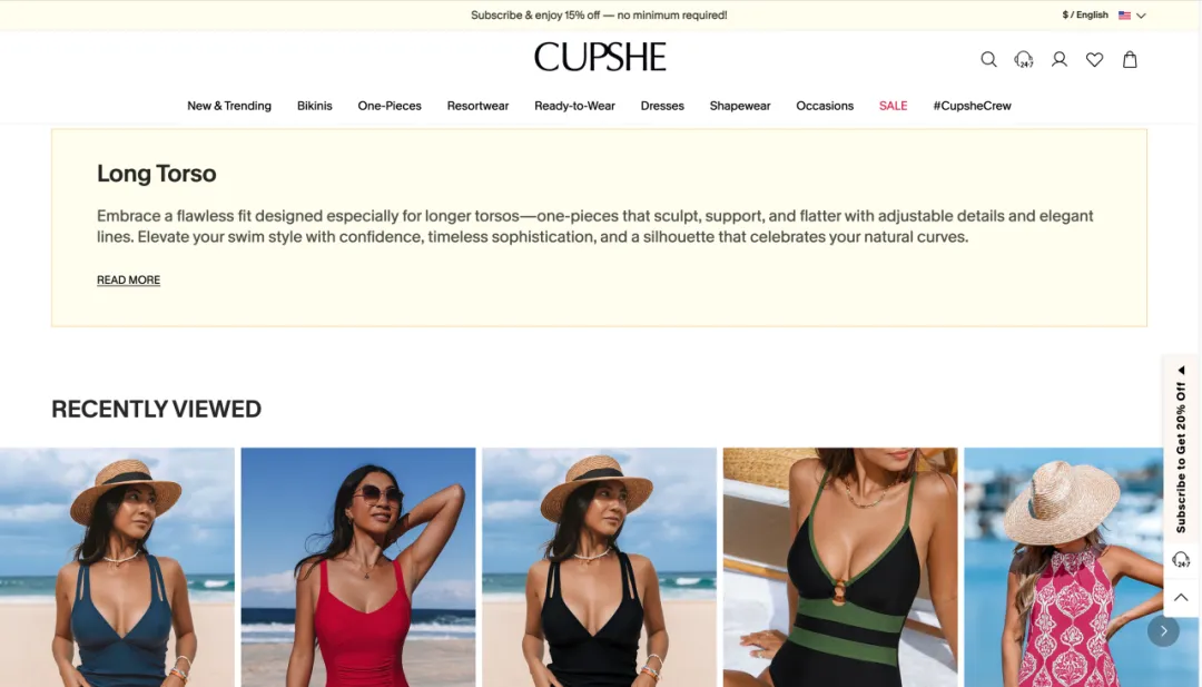 和许多泳装网站强调“模特大片”不同,Cupshe 在产品页和内容体系中,刻意弱化完美感,强化真实感: