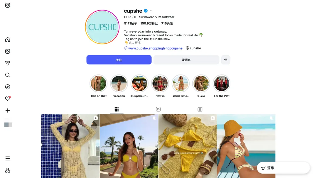 ◽️ Cupshe 在 Instagram 上已累积 150万+ 粉丝,相关话题内容 #cupshe 已累积 11.8万+ 帖子。