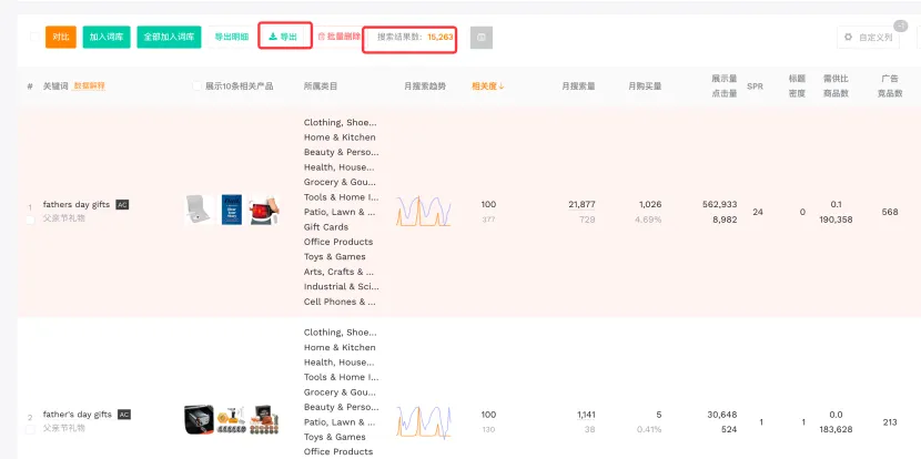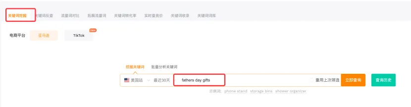 打开卖家精灵的关键词挖掘,输入fathers day gifts查询。