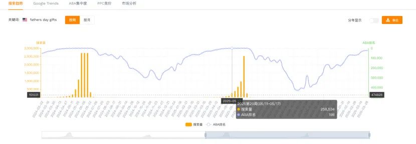 点击fathers day gifts的趋势图,可以看到去年ABA的波动情况。