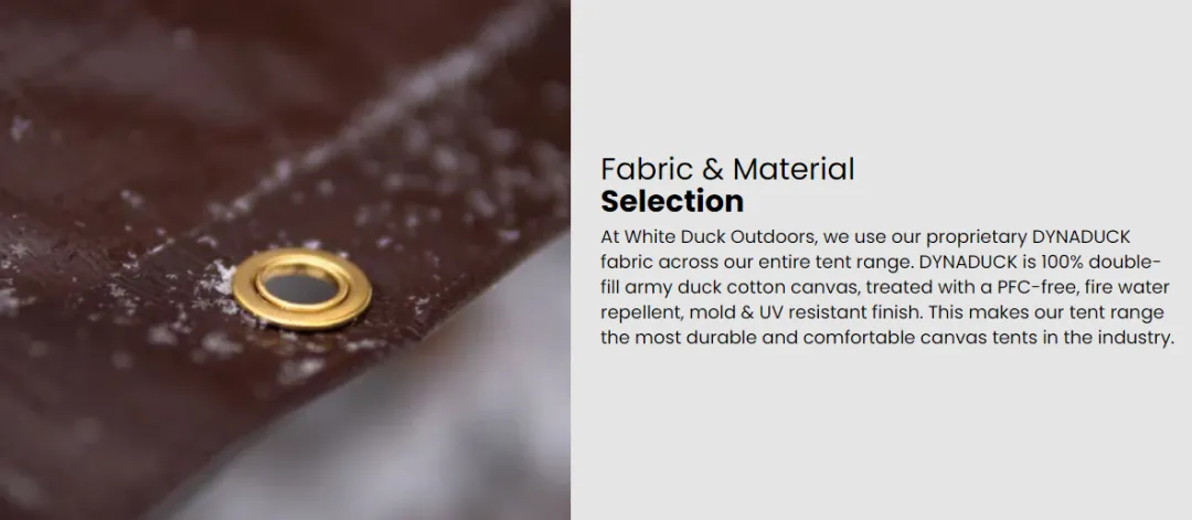 高规格面料:在购买高客单价帐篷时,消费者最关注的永远是三件事:够不够耐用?能否应对极端天气?是否使用安全材料。针对这一核心痛点,White Duck采用自主研发的DYNADUCK双股棉帆布,并进行防火、防水、抗UV等多重处理,同时强调PFC-Free认证,甚至公开材料选择原则。