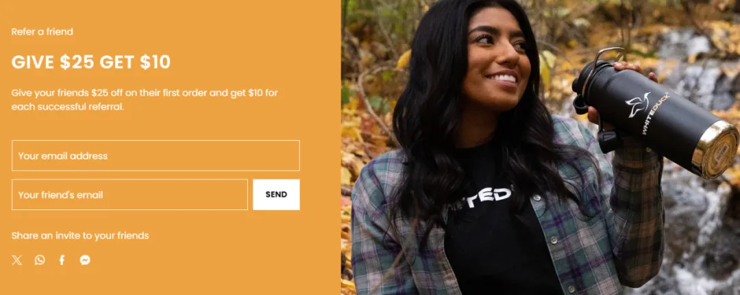 推荐有礼:在购买高客单价产品时,用户最大的心理压力往往来自对“实际体验是否匹配价格”的不确定性,因此其会更依赖熟人推荐作为信任锚点。White Duck推出的“Give $25,Get $10”推荐有礼活动,让老用户获得奖励、新用户享受折扣。