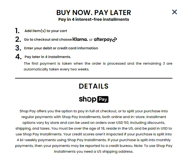 为此,White Duck提供分期付款服务,并接入多家BNPL支付方式。BNPL对高客单价品类的转化提升非常明显:消费者会把“一次付1000美元,理解为每两周付250美元”,心理阻力大幅下降。对品牌而言,BNPL不仅能提升即时转化率,还能拓宽受众范围。