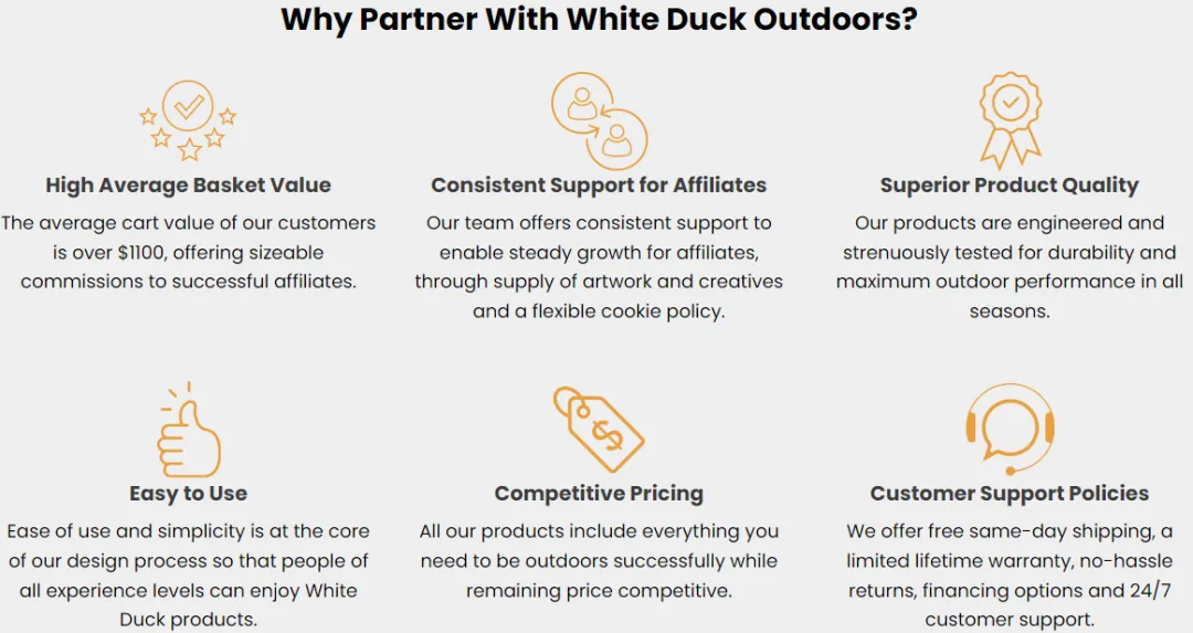 联盟营销:对于希望找到优质商品并稳定变现的联盟推广者而言,他们最关注三件事:佣金是否可观、产品是否易推广、品牌是否能支撑转化。White Duck在这三方面都具备明显优势,首先其平均订单价值超过1100美元,这意味着即便佣金比例适中,推广者依然能获得可观收益。