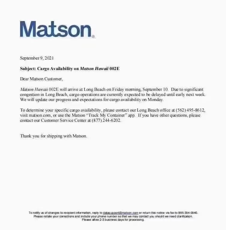 从图中可以看出,9月9日美森发出的消息显示,Matson Hawai 002E原定9月10日星期五早上抵达长滩,但由于长滩严重拥堵,目前预计货运作业将推迟到下周,美森会在下周一也就是9月13日更新对货物供应的进展和预期。