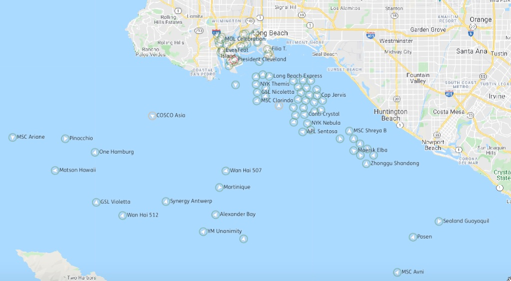 据监测圣佩德罗湾海上交通情况的官员称,截至上周五晚些时候,有55艘船只在离岸更远的地方抛锚或闲置,等待在洛杉矶和加利福尼亚长滩这两个港口卸货,而两周前为40艘。