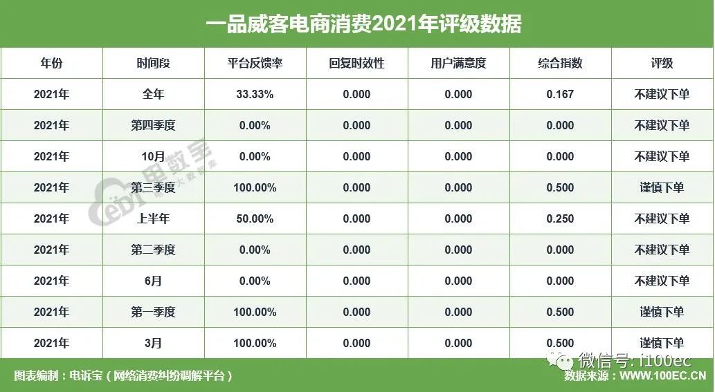 据网经社旗下电商大数据库“电数宝”监测数据显示,2021年厦门一品威客网络科技股份有限公司旗下“一品威客”共获得9次消费评级,其中,6次获“不建议下单”评级;3次获“谨慎下单”评级,2021年最终获“不建议下单”评级。同时,“一品威客”存在网络欺诈、退款问题、冻结商家资金的问题。