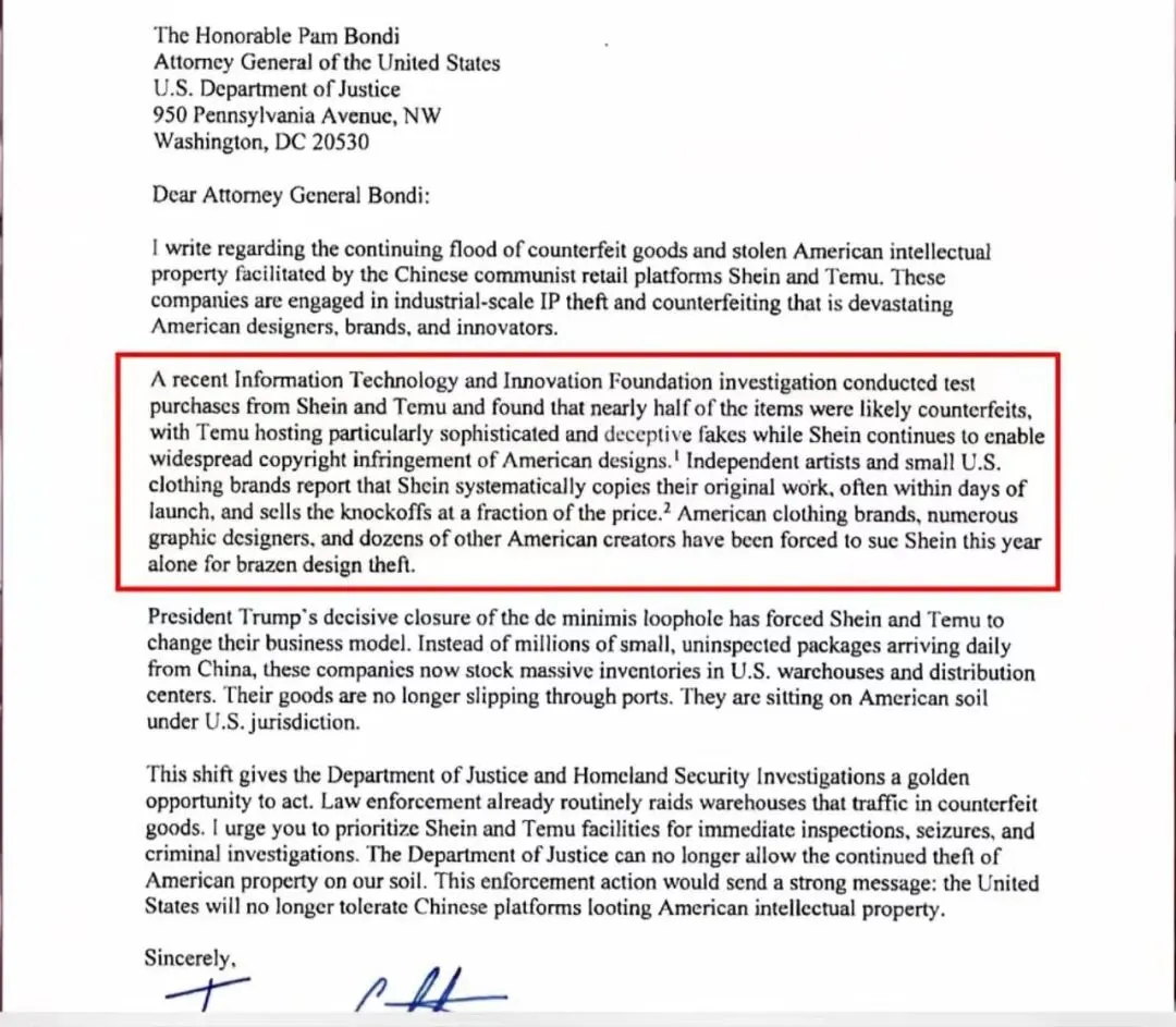 值得关注的是,科顿特别强调,特朗普政府此前取消800美元小额包裹关税豁免政策后,卷王T与卷王S为提升配送效率、规避清关风险,已将大量库存转移至美国本土仓库,使这些货物处于美国司法管辖范围内,为执法机构采取行动创造了"难得的机会窗口"。不过,截至目前,这一诉求仍停留在政治施压层面,美国司法部尚未公开回应是否启动调查,海关、联邦调查局(FBI)等执行机构也未采取任何实质行动。