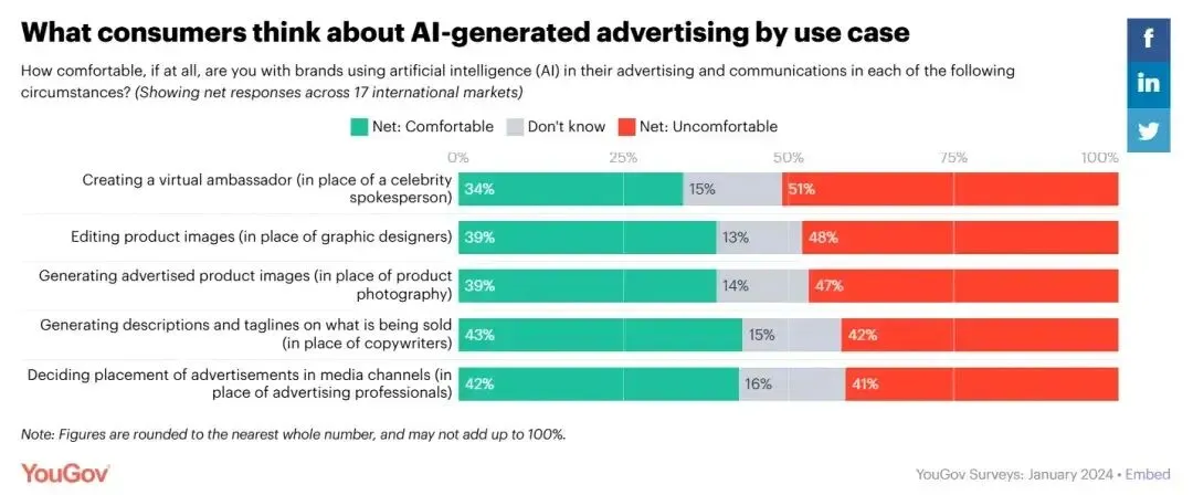 YouGov曾做过关于消费者对于AI营销看法的调查,结果显示多数消费者认为直观的AI营销会让他们感到不适。不同地区用户对于AI营销接受度也存在明显差异,例如法国、瑞典、英国、西班牙、加拿大和意大利的消费者对广告中的人工智能最为抵触。