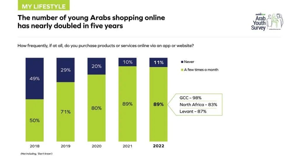 结果显示,在网上购物的阿拉伯青年人数在五年内几乎翻了一番,几乎所有年轻的海湾合作委员会公民都表示他们每月至少通过社交媒体应用程序或网站购物几次。