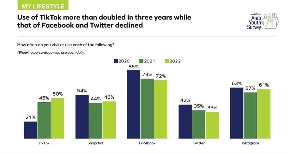 大家使用社交媒体习惯也正在发生变化,有一半的阿拉伯青年表示他们每天都使用TikTok,是 2020年使用该应用的人数(21%)的两倍多。现如今,TikTok是继WhatsApp、Facebook、Instagram和YouTub 之后的第五大最受欢迎的社交媒体应用程序。