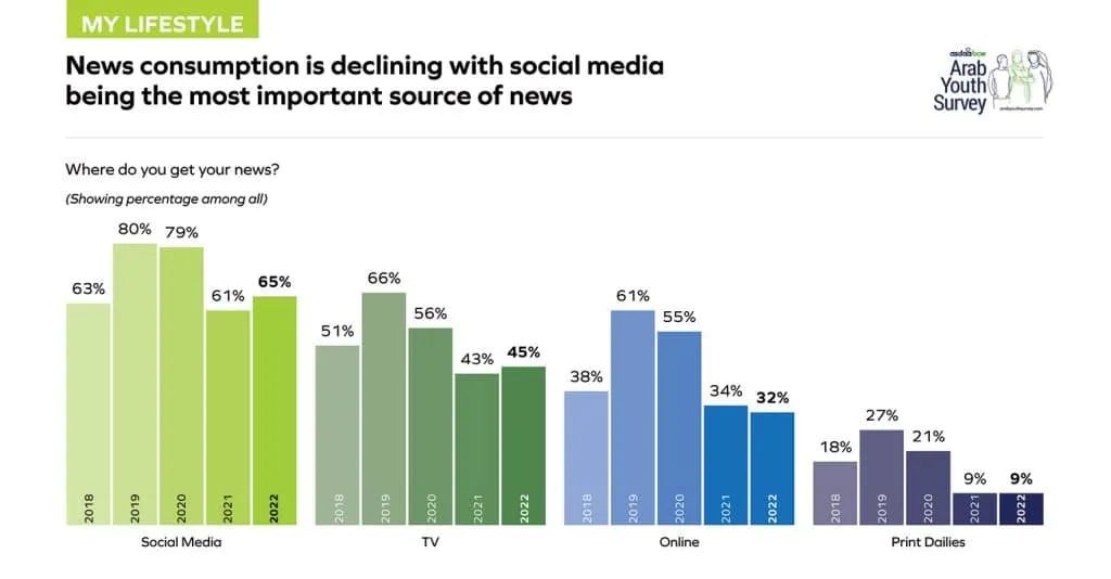 66%的年轻阿拉伯男性和女性认为社交媒体也值得信赖,而信任印刷报纸和网络新闻来源的比例为71%。