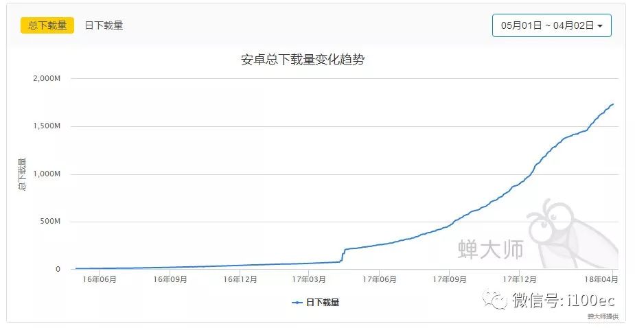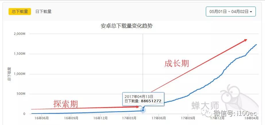 (数据源自蝉大师。 2015.05.01 – 2018.04.02 期间的总下载量趋势图。)