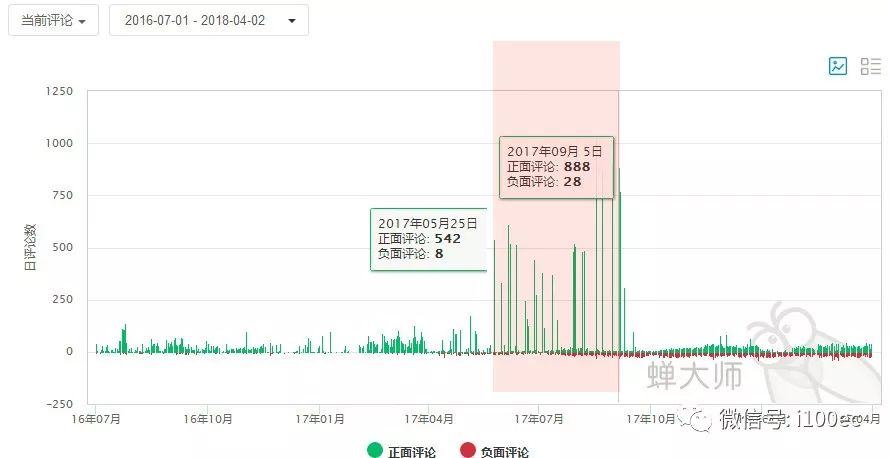 (数据源自禅大师。自2016年7月到2018年4月2号,用户对于拼多多的正面和负面评论比例)