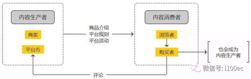 在“内容生产者”这一节点:包含拼多多平台方,它制订了平台的交易、信息等的规则;包含入驻的商家(个人、企业),为平台贡献商品的信息内容,比如商品的图片、名称、详情页描述等。