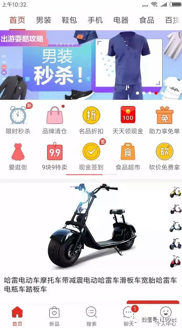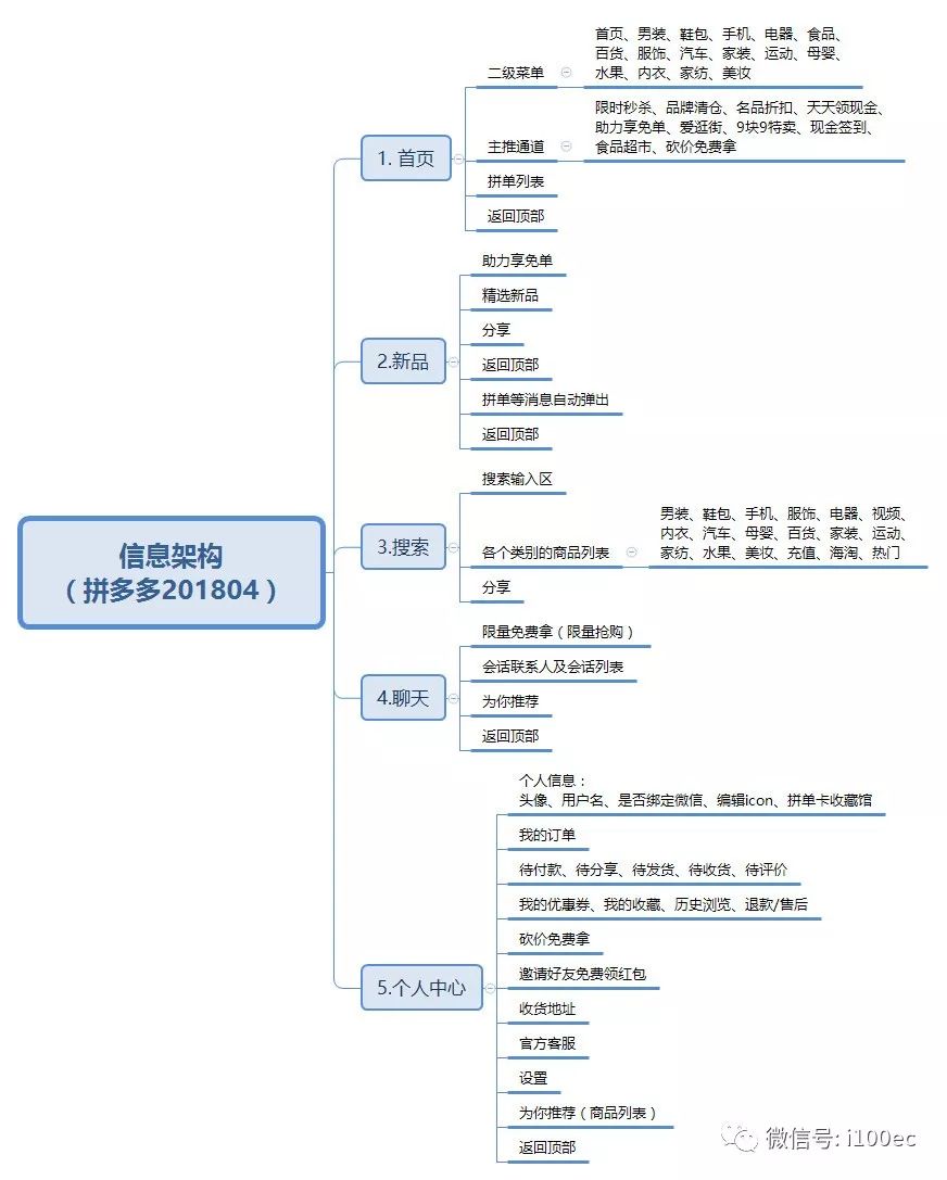 拼多多app,分为4大模块,分别为:首页、新品、搜索、聊天、个人中心。