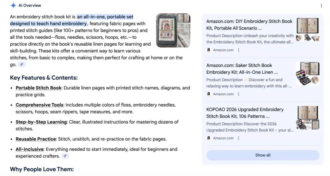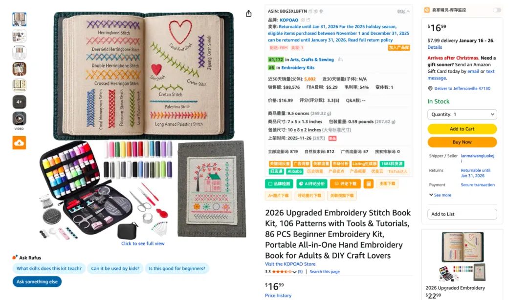 市场上总会有一些打破常规的产品出现。近期,在前台发现了一款Embroidery Stitch Book Kit刺绣针法书套件的产品表现极为反常。下面对这个产品进行复盘。