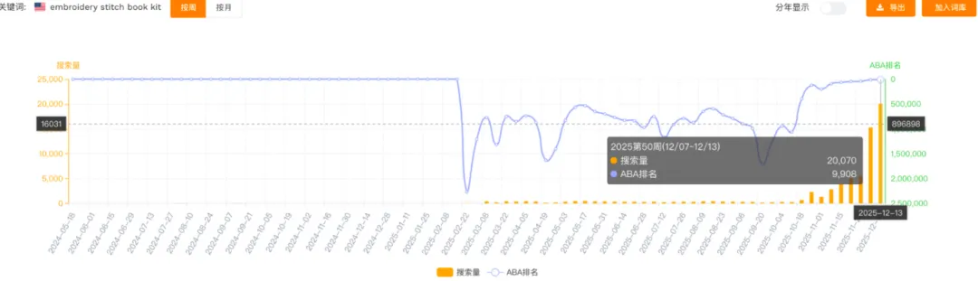 为了探究这场爆发的起点,调取了该关键词的ABA排名历史数据。在长达半年的时间里,Embroidery Stitch Book Kit是一个极度冷门的关键词,ABA排名在200万名开外,几乎没有自然搜索流量。时间来到11月初,该关键词的搜索排名突然呈90度垂直拉升。仅用一个月时间,到12月初,其ABA排名已冲入前1万名,搜索热度暴涨数百倍。