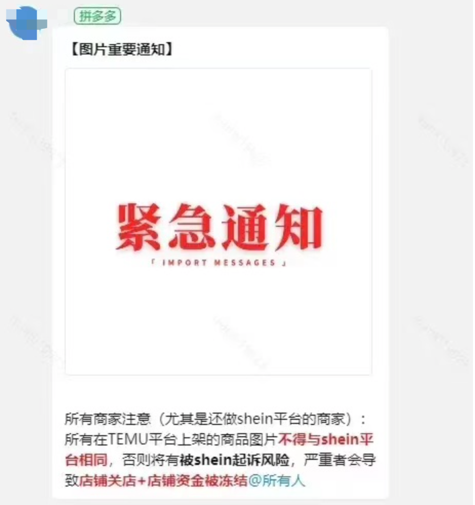 最近,Temu经理特别在商家群里发出“紧急通知”,要求所有商家,特别是还做shein平台的商家,上架的图片不得与shein平台相同,否则将有被shein起诉的风险,严重者会导致店铺关店和店铺资金被冻结。