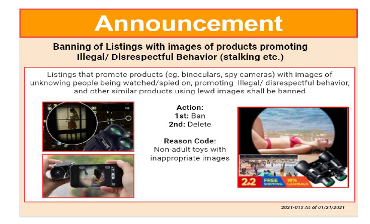 任何偷窥产品例如望远镜或偷窥相机都禁卖,会被 Listing 删除