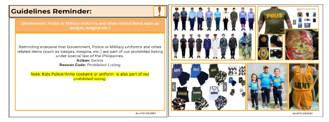 CB 卖家禁止售卖任何附有政府,军队,警队徽章、制服等等的儿童成人产品都不能在菲律宾卖,会直 接被 Listing 删除