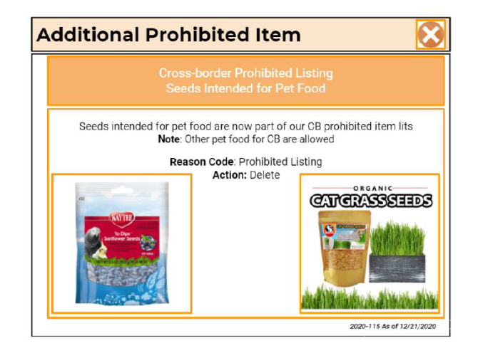 CB 卖家禁止出售种籽有关的宠物食品。例如像葵花籽,猫草籽等等产品