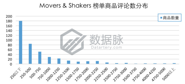 在登榜 Toys & Games 品类Movers & Shakers榜单的商品中,单个商品拥有的最大评论数为37866.0,最小评论数为0.0条,平均评论数831.98条,评论平均星级4.4星。在上榜商品中,有41.28%的商品评论数在250条以下,该区间商品数量进一步增加;有19.27%的商品评论数位于250-500区间内;另有3款商品的评论数超过5000条,占比为0.69%。骆探长(shujumai.com)发现,相比上期分析,本期上榜商品的平均评论数基本持平,平均星级增加了0.05星。