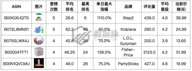 骆探长(shujumai.com)发现,在Toys & Games品类的Movers & Shakers榜单分析中,品牌Step2的野餐桌子模型登榜5次,以平均排名26.6,夺得综合排名首位,其单日最大涨幅高达1110.0%;