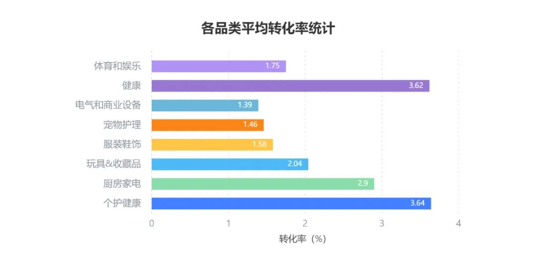 再按照行业来细分平均转化率(CRA)的话,目前与工艺品相关的产品在电子商务中的转化率最高,为 4.91%。紧随其后的是个护健康,占 3.64%,厨房和家用电器占 2.9%。