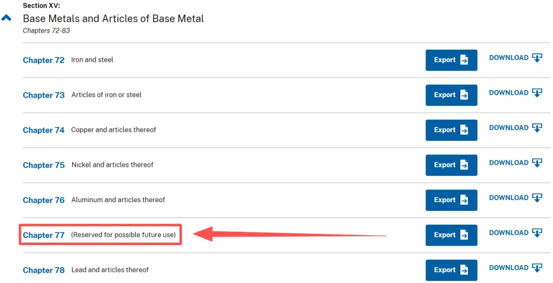 HTS 涵盖 22 大类(Section),细分为 99 章(Chapter),商品在 HTS 第 1 章至第 97 章的规定中进行分类,各章都由一个 2 位数编码组成,各章中的每个产品类别由 4、6、8 或 10 位数编码指定。但不是所有 HTS 章都是用来直接给商品归类的,美国协调关税表 HTS 中有 3 章的功能不同于其他普通商品归类章:第 77 章(Chapter 77)为预留章(Reserved),目前未启用,没有任何税目,不用于商品归类、申报、征税,可以简要理解为“空章/占位符”;第 98 章(Chapter 98)为特殊税则归类规定以及第 99 章(Chapter 99)为临时性贸易立法及临时税则调整与进口限制规定(关税政策章)。