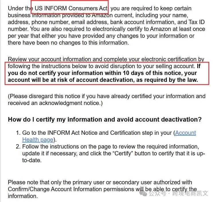 根据《美国消费者告知法案》,您需要及时更新某些业务信息(如下所示),并且以电子方式向亚马逊证明已更新这些信息,或者已提供的信息仍为最新信息。在查看本通知后的10 天内证明您的以下信息为最新信息,否则您的账户将面临被停用的风险。
